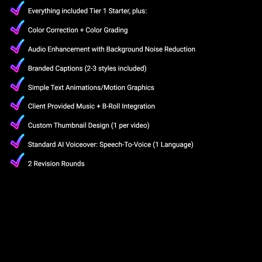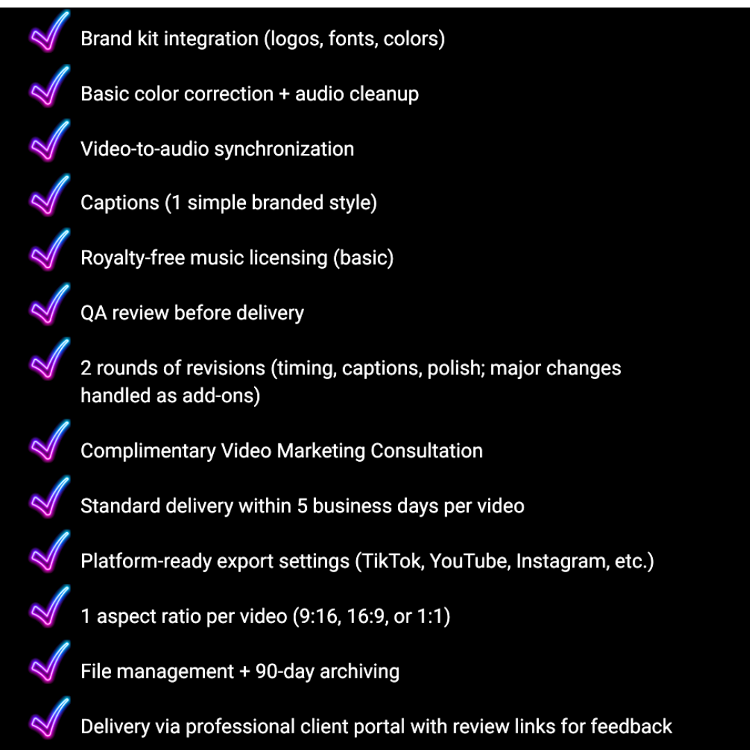 ✓ 2 rounds of revisions (timing, captions, polish; major changes handled as add-ons)